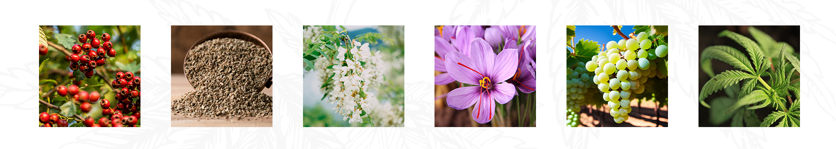 Účinné látky: suchý extrakt z plodu hlohu (Crataegus monogyna), suchý extrakt zo semien zeleru (Apium graveolens), RIM concentrate forte (zmes extraktov z plodov viniča hroznorodého a extraktu z pivovarníckych kvasníc v pomere 1:1), extrakt z konopných semien, rutín extrahovaný z kvetov sofory (Sophora japonica), suchý extrakt z kvetov šafranu (Crocus sativus).