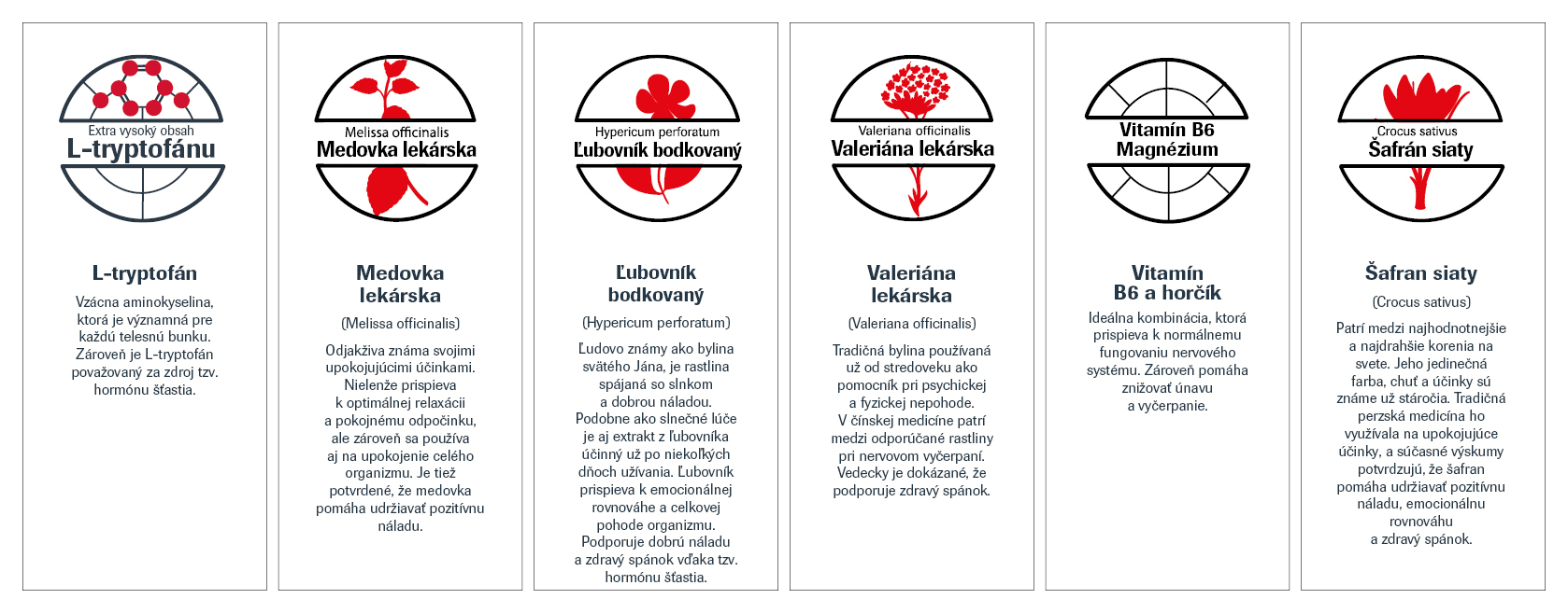 Účinné látky: L-tryptofán, extrakt 2valeriány lekárskej, extrakt z 3medovky lekárskej, extrakt z 4ľubovníka bodkovaného, extrakt z 5šafránu siateho, 1vitamín B6, horčík.