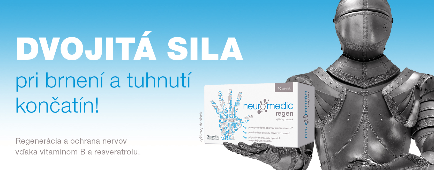 Fungovanie nervovej sústavy ovplyvňuje nielen vek, fyzická záťaž, škodliviny z okolitého prostredia, úrazy či genetické predispozície, ale aj nedostatočná výživa. Všetky tieto vplyvy sa môžu negatívne podpísať na citlivosti a funkčnosti nervov alebo sa môžu prejaviť pocity brniacich, tŕpnucich, či nepokojných končatín. Neuromedic Regen je výživový doplnok s vysoko účinnými dávkami tiamínu, pyridoxínu a kyanokobalamínu obohatený o resveratrol z viniča hroznorodého. Vďaka tomu Neuromedic Regen podporuje výživu nervových buniek2, ich správnu funkčnosť 1,2,3 a ochranu pred škodlivinami4.